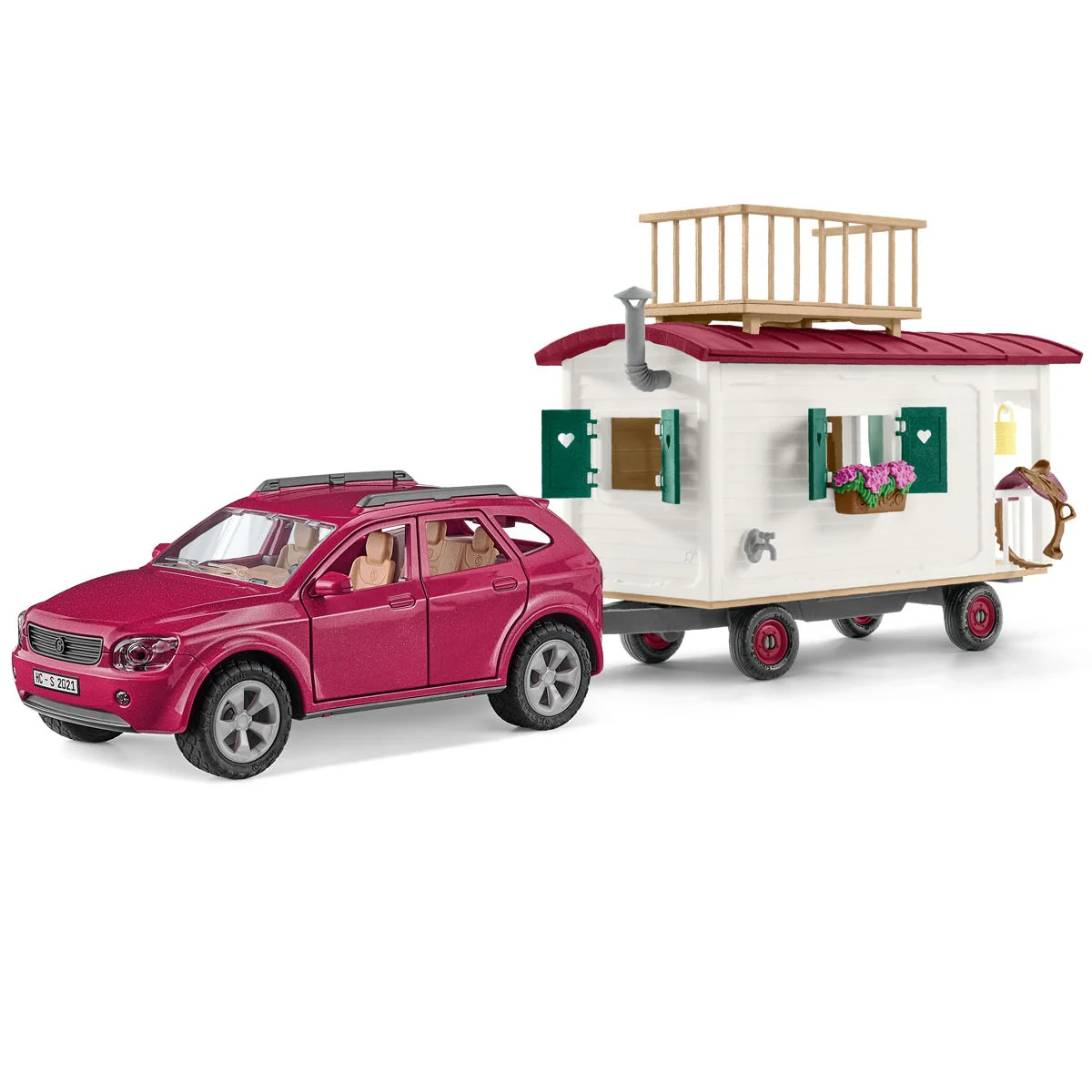 When Mr. Kramer and Hannah go on vacation, it goes without saying that the Cocker Spaniel and their Quarter Horse mare come along, too. Luckily they have a large caravan and they can all fit in it. Mr. Kramer attaches the trailer to his SUV, and Hannah packs the saddle, bridle and horse care accessories. That way, she can take the mare out for a ride and explore the area along the way. At night, the mare is cozy under her sunshade in the pasture, while the others make themselves comfortable on the couch inside. What a great way to travel!