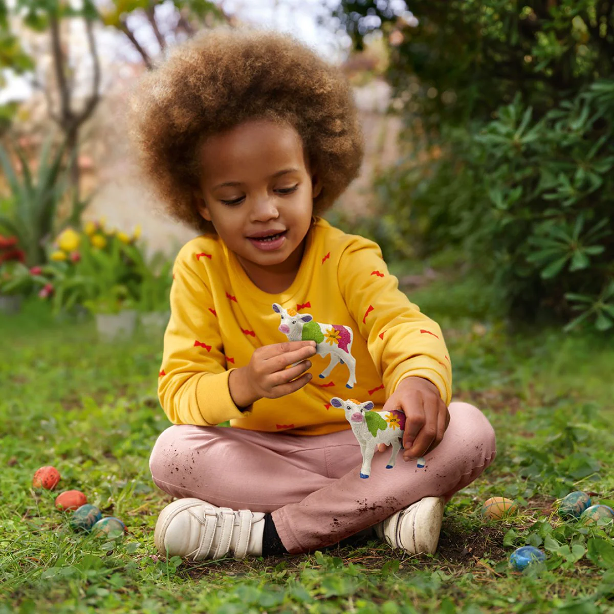 Our small, colorful spring calf frolics about the pasture, inquisitively discovering the exciting world around it. Where did all those colorful spots on its body come from? Did it eat too many of the colorful spring flowers in the pasture? Or did it fall into Farmer Paul's paintbox? Did the calf meet up again with its friends from the other schleich® worlds and come away from each of its adventures with a small dab of paint on its body? In any case, the colors suit the calf splendidly.