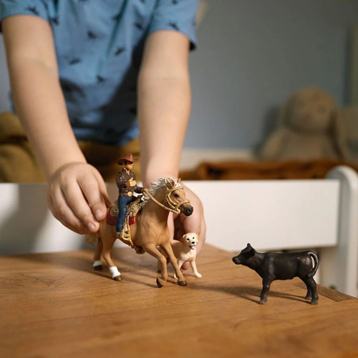 Grab them reins and round up the Black Angus calf...there's chores to do back at the ranch, and your trusty pup is fixin' to lend a hand...er, paw. Yeeeeee-HAW! The Western Riding Adventures playset is great for kids who love cowboys and cowgirls...kids who dream of learning to rope and ride.